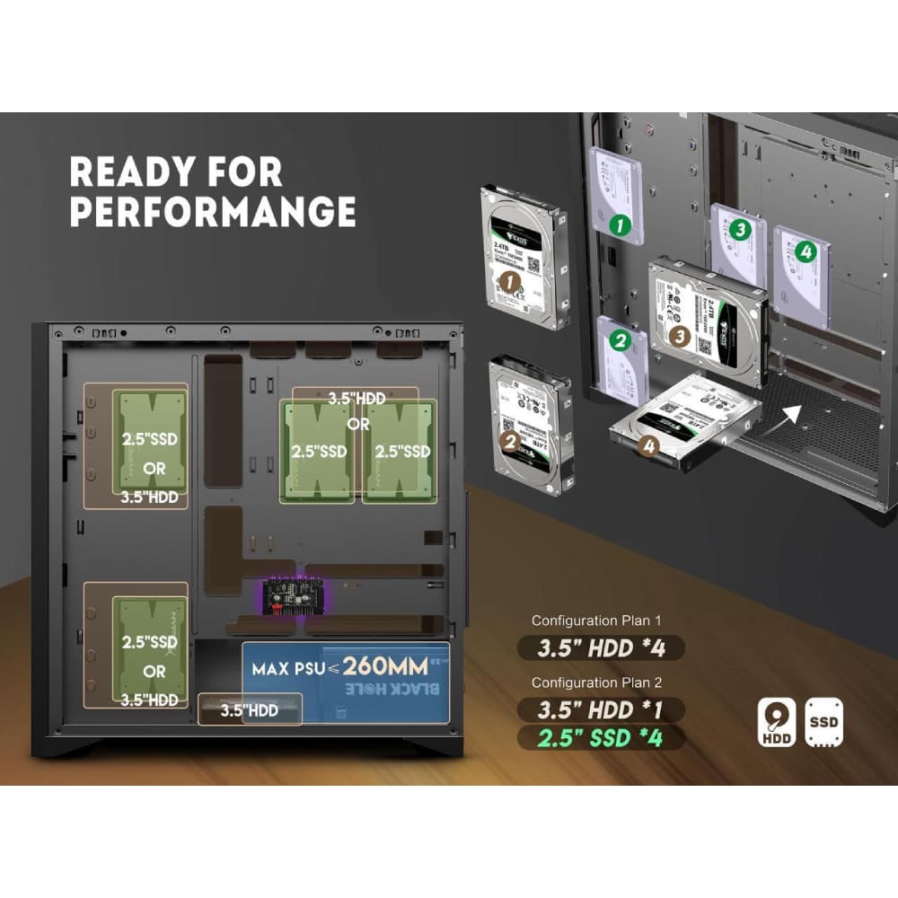 - Pre-Installed ARGB Fans: Comes with four ARGB fans (1600 RPM) and an ARGB/PWM fan hub for lighting control and motherboard sync.